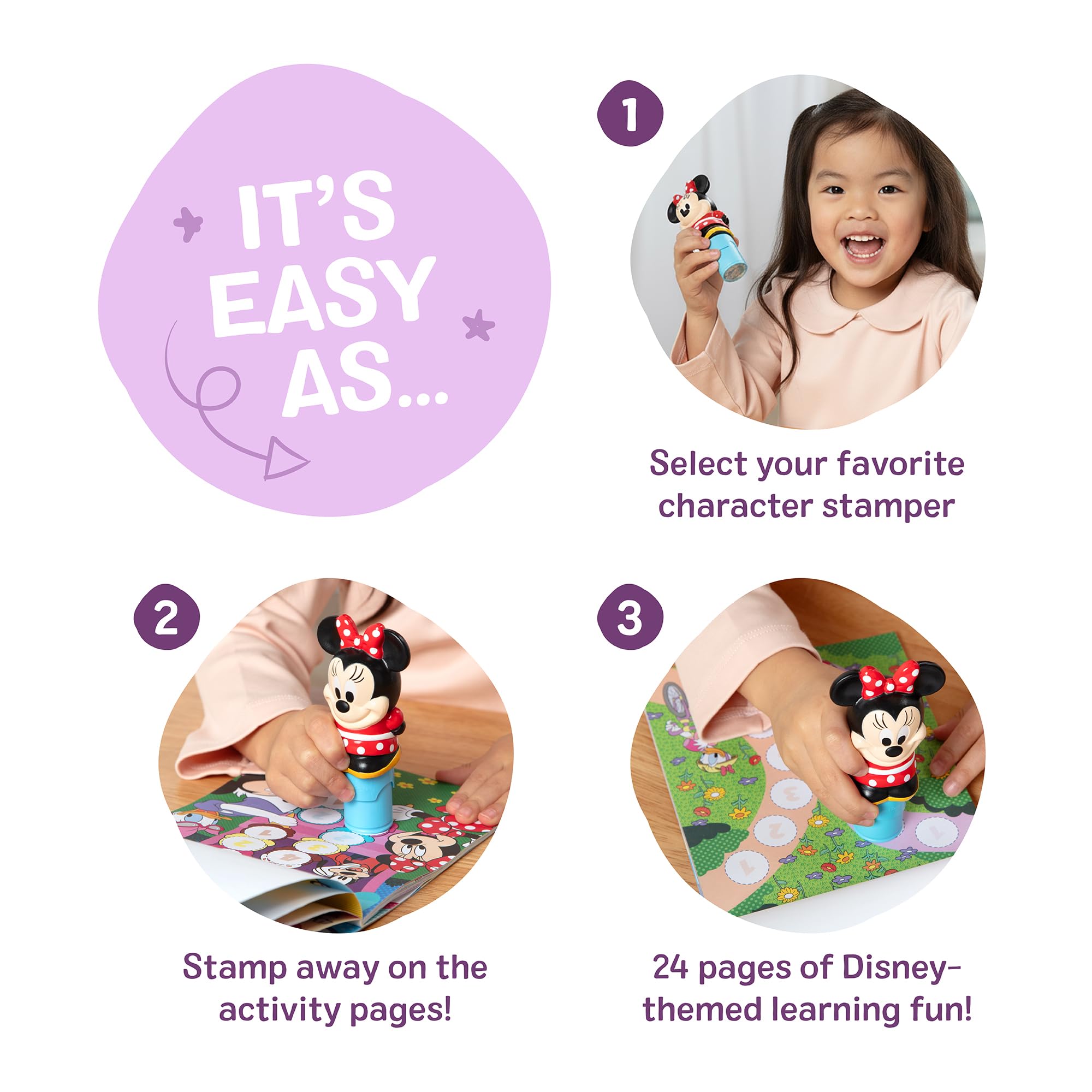 - A Whole New Way to Play with Stickers - Collectible toy stamper dispenses Disney-themed stickers on the 24-page Disney Minnie Mouse activity pad and other creative art projects, no peeling required!